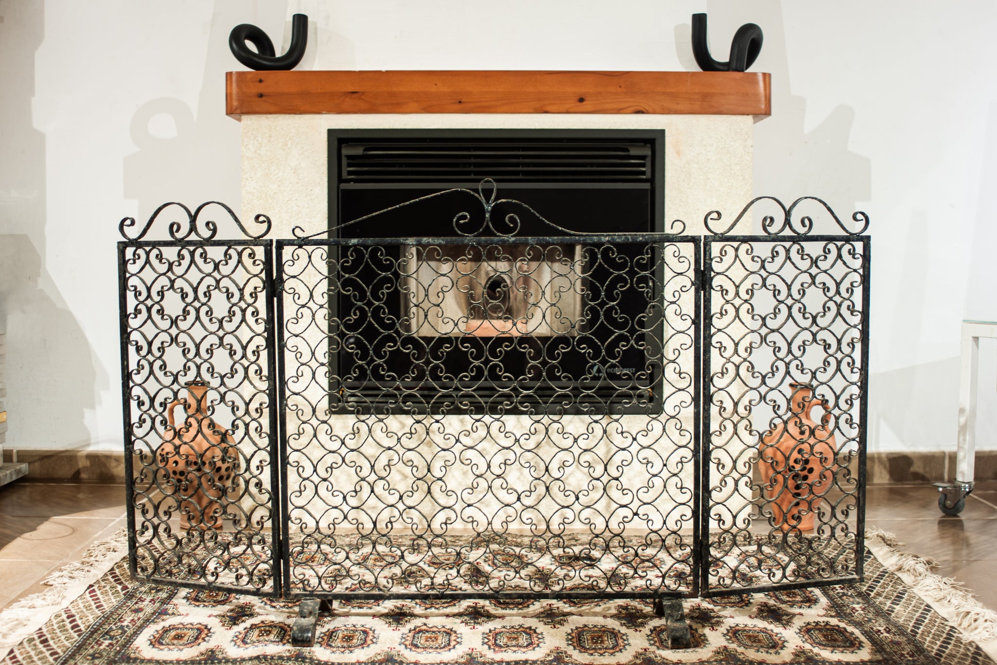 Ornate wrought iron fireplace guard. Midcentury Spanish work.